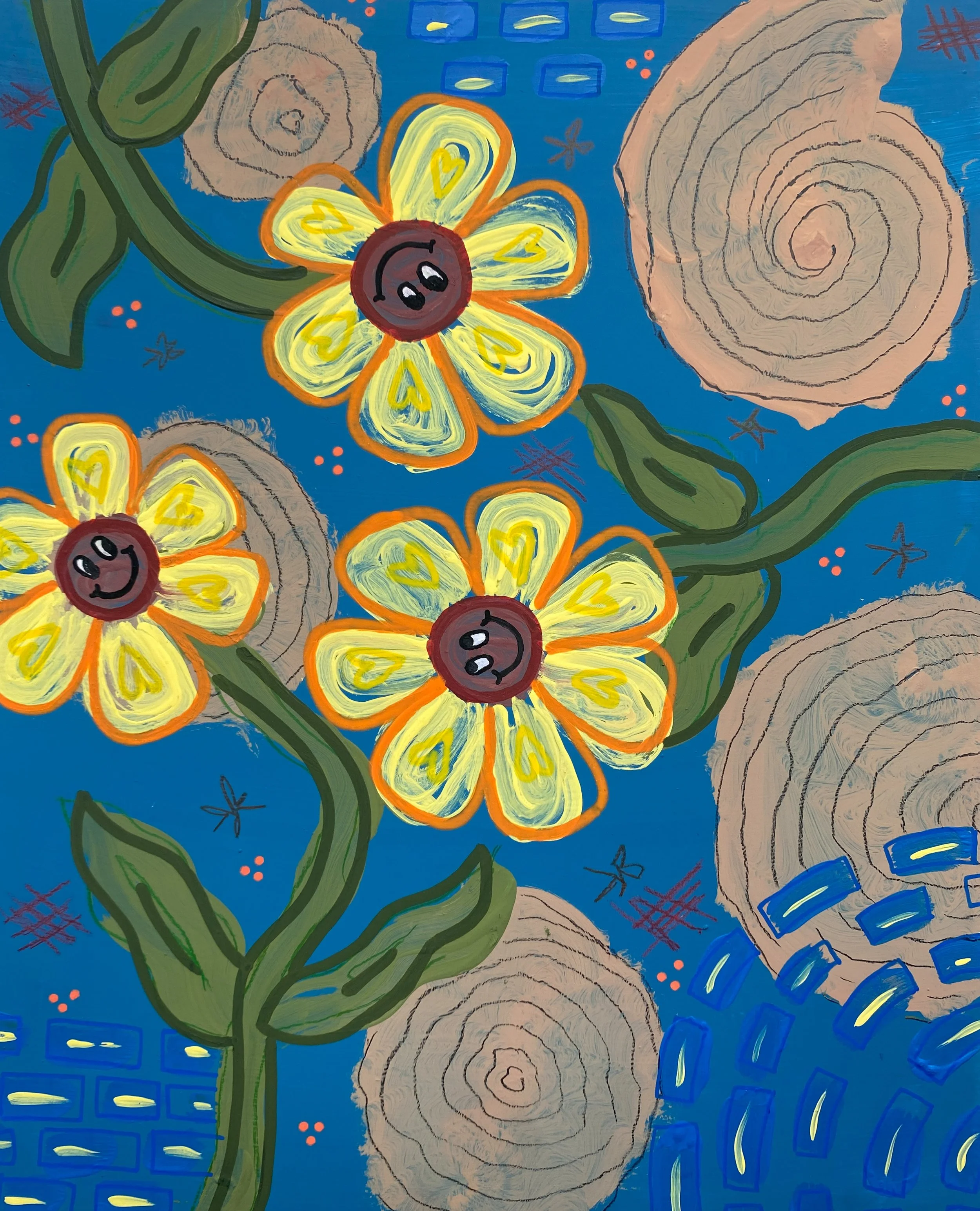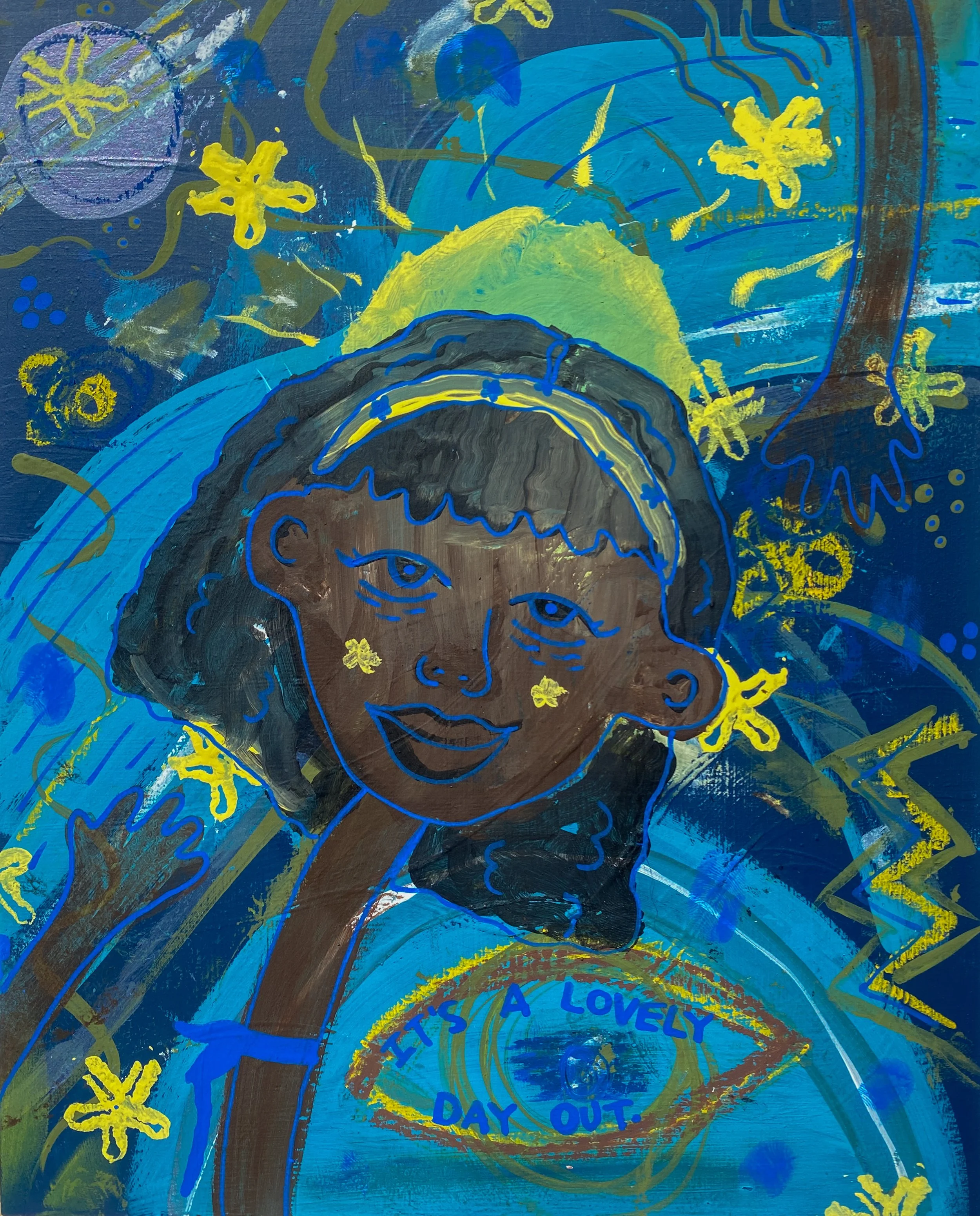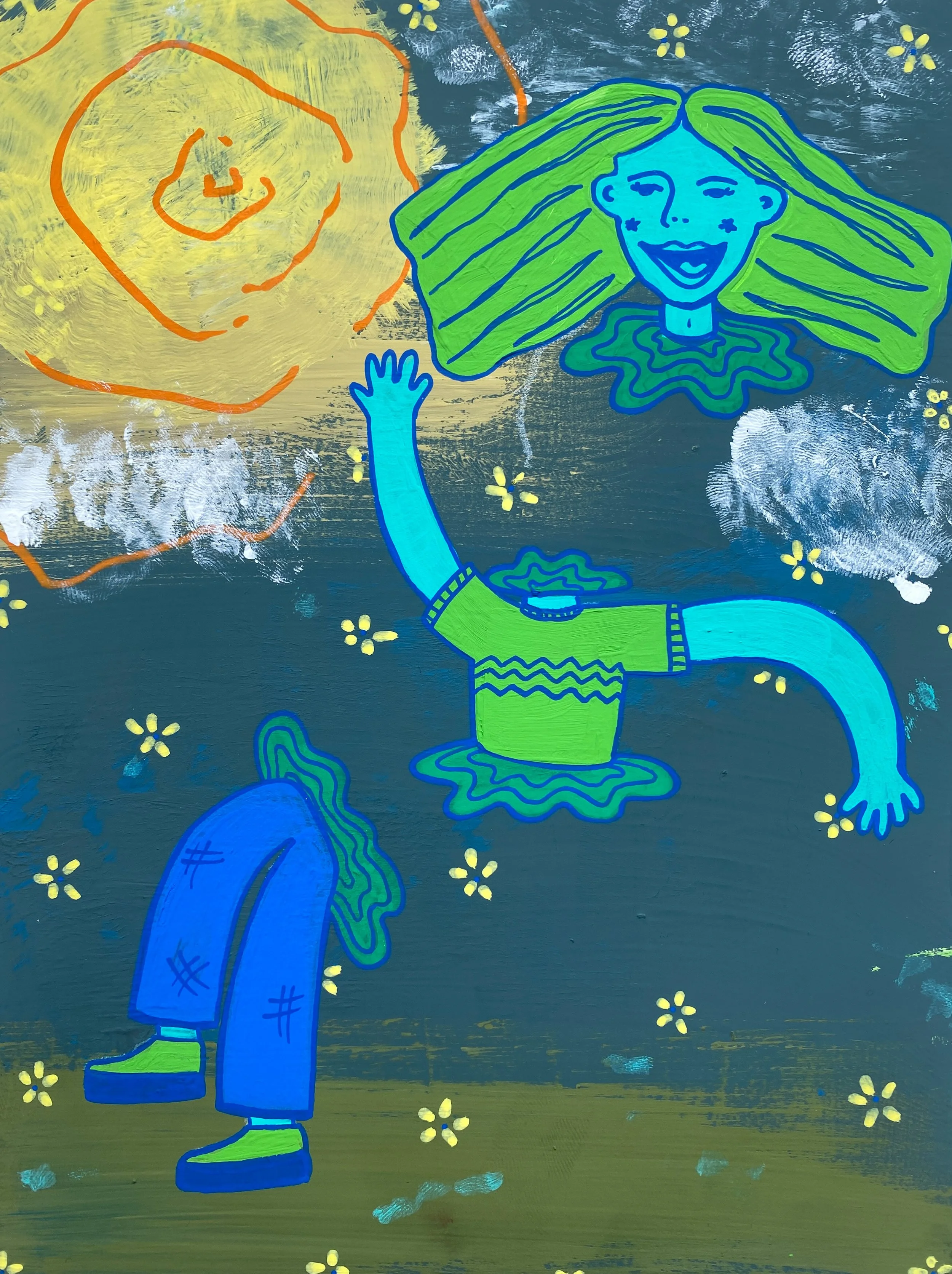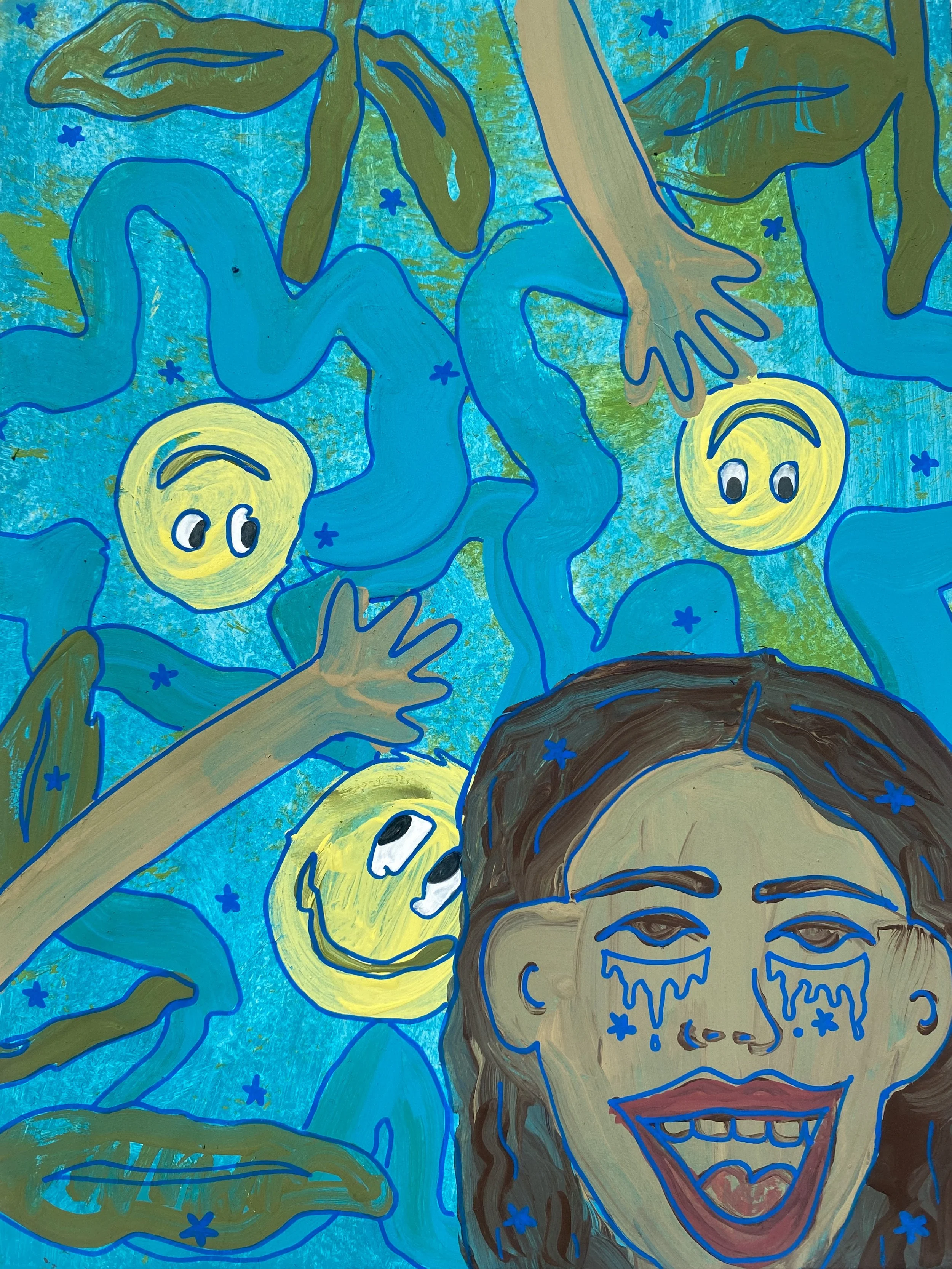 multimedia: acrylic paint, color pencils, posca markers, and oil pastels on wood canvas.